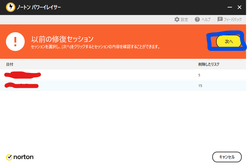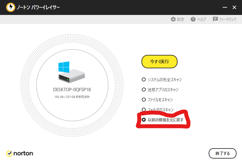 - Norton Power Eraserで削除したファイルを復元するには「以前の修復を元に戻す」を選んで実行する